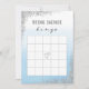 Bridal shower bingo card with faux silver glitter design and ombre blue watercolor background.