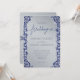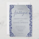This wedding invitation presents a refined combination of deep blue tones paired with shimmering silver detailing. The intricate silver damask frame enhances the design’s sophistication, while the soft central panel elegantly highlights the couple’s names. The contrast between cool blue and metallic silver creates a modern yet timeless aesthetic, perfect for evening weddings, winter celebrations, or any event seeking a touch of luxury and grace.