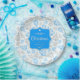 A gentle and elegant Christmas pattern with a blue badge with Merry Christmas and Happy New Year script.