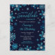 This elegant and glamourous invitation postcard features watercolor blue and silver faux glitter snowflakes and sparkles on a navy blue background. It is perfect for a winter or Christmas themed birthday party.