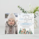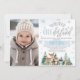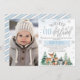 Cute photo blue and silver woodland winter one-derland themed first birthday invitation featuring four cute woodland animals, some pine trees, a blue banner, a decorative silver glitter heading and snowflakes. This boy's woodland winter one-derland birthday invitation also features some silver glitter dots and a striped blue and silver back.