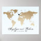 Light blue and tan vintage look world map guest signature poster (it's a great unique alternative to a traditional guest book) with an optional heart location marker looks great displayed in your home after a travel theme wedding, destination party, mitzvah celebration, or shower.