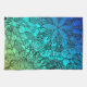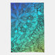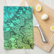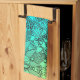 a decorative mandala pattern design in primarily blue and turquoise colours with lots of geometric ornamental elements on a kitchen towel