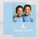 Destei's pastel blue Easter card template featuring a bunny silhouette and two Easter eggs in white color. The top half is a photo template for a custom family photo and the bottom displays a “Happy Easter!” message with space for a family name and year. Perfect for creating a cute, personalized Easter greeting. The other side of the card is blue.