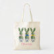 This Easter cotton tote bag features cute bunny rabbits green topiaries with pink, blue and yellow bows in blue and white chinoiserie flowerpots. Personalize the name on the front and holiday message on the back with your choice of special text.