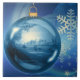 A landscape reflects in a blue Christmas ornaments while snowflakes fall around it.