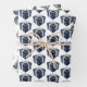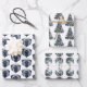 Here are three coordinating wrapping sheets with a blue and white theme. The first sheet has a gift box pattern, the second sheet has a Christmas tree design and the third sheet has a mirror image ornament pattern.