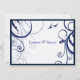 Dark Blue and White Wedding Invitation. White background with dark blue vines/scrolls. Two dark blue birds fly off together to begin their happy life. Text and font are customisable. Background colour on reverse can be changed as well.