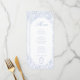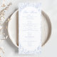 This soft Delft blue floral wedding menu is designed in a refined blend of chinoiserie and French toile de Jouy style. Delicate botanical illustrations frame an elegant oval arch layout, creating a timeless and romantic presentation. The menu includes space for three courses on front and a complete bar menu on the back, making it both beautiful and practical for your special day.