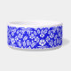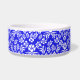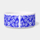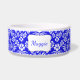 White ceramic dog food / water bowl, with a blue and white floral damask pattern, around the outside. A white text area, on the front of the dish, has blue custom text ready to personalise. Matching pet products are available.