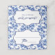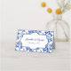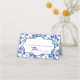 A wedding place card featuring a blue and white floral toile design.