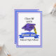 A blue and white school colours invitation card for a 2023 graduation party for both him and her, just add a name and party details. Personalise these graduation invitations with your graduate's name and school. A blue graduation cap mortarboard with a yellow tassel. A blue banner to personalise with the student's name, add their graduation year and the name of their high school, college, or university.