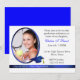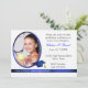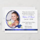 Elegant graduation party invitation done in white and blue colours, with an oval cut out for the graduate's photograph. A blue mortarboard cap decorates the bottom of the photo area. Personalise the text for your grad's party.