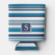 Keep your drink cold in bespoke preppy style with our monogrammed can cooler. Design features a variegated horizontal stripe pattern in cool summer blues, with your single initial or family monogram in coordinating navy blue. If not monogramming, simply delete the sample initial and click "clear" to remove the blue square.