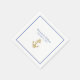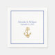Blue and white wedding napkins done in a nautical themed, with graphics of a golden anchor. Personalise with the bride and groom's names and wedding date. Matching products are available.