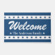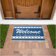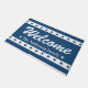 This blue and white doormat features a border of patriotic stars on the top and bottom with 'Welcome' in a large white decorative script. Personalise by adding your name, family name or special text. Perfect for the summer season and July 4th holiday.
