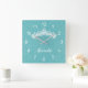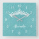 This wall clock is printed with a cute doodled tiara image on a light teal blue swirly patterned background. It has simple, easy to read white numerals and a personalised name. Sure to please any little girl who loves princess themes. Your choice of square or round.