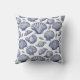 Summer beach house themed pillow with clam, scallop and seashells in blue and white for coastal, nautical decor.