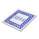 A hand drawn blue and white chequered frame around a blue house number on a white background with dark blue outlines.