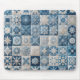 A quilt showcases intricate patterns resembling snowflakes, each block featuring unique blue and white designs