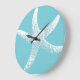 A white starfish against a blue clock face. Keep time with this modern coastal clock. Perfect for your beach house or coastal decor.