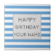 A cool light blue and white striped pattern and a Happy Birthday text template. Click personalise to add your name.