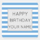 A cool light blue and white striped pattern and a Happy Birthday text template. Click personalise to add your name.