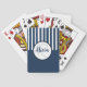 Simple, classic, and stylish, this card deck features vertical, navy blue and white stripes, with a wide, blue colour block at the bottom. A round badge holds your name and monogram. Great stocking stuffer!