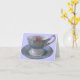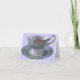 Beautiful blue and white teacup and saucer with pink rose and gold trim.