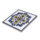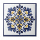 Each corner within the navy blue border is adorned with small, detailed elements such as stylised blossoms or ornate scrolls, creating a sense of cohesion and balance. These corner details mirror each other, adding to the tile's symmetry and enhancing its decorative appeal.