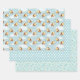 A set of three bumble bee themed gift wrap sheets including a bumblebee, honeycomb, and floral patterns.