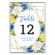 This beautiful and elegant wedding table number sign features watercolor blue, yellow and white flowers with foliage on a gold geometric frame. The text combines handwritten script and serif fonts for a stylish and modern look. This is perfect for a spring or summer rustic wedding.
