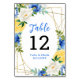This beautiful and elegant wedding table number sign features watercolor blue, yellow and white flowers with foliage on a gold geometric frame. The text combines handwritten script and serif fonts for a stylish and modern look. This is perfect for a spring or summer rustic wedding.