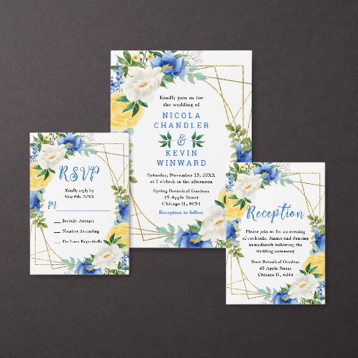 This beautiful and elegant wedding thank you sticker features watercolor blue, yellow and white flowers with foliage on a gold geometric frame. The text combines handwritten script and serif fonts for a stylish and modern look. This is perfect for a spring or summer rustic wedding.