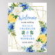 This beautiful and elegant wedding welcome sign features watercolor blue, yellow and white flowers with foliage. The text combines handwritten script and serif fonts for a stylish and modern look. This is perfect for a spring or summer rustic wedding.