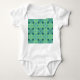This baby bodysuit has a mid-century modern design of arrows in two shades of blue on a field of seafoam green.