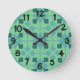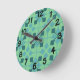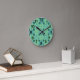 This wall clock has a mid-century modern design of arrows in two shades of blue on a field of seafoam green.