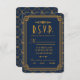These RSVP response cards feature a blue and gold colour palette, a geometric frame, geometric patterns, and other stylistic details all inspired by Art Deco and the roaring twenties. You can customise the sample text fields to your liking.
