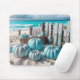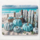 Turquoise pumpkins are nestled in the sand near a rustic wooden fence on a beach, with the vibrant sea and sky creating a serene backdrop