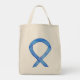 Tote bag features blue awareness ribbon art. The blue awareness ribbon colour means support for ALS, Free Speech, Foster Care Awareness, Colon Cancer, Child Abuse Awareness, Drunk Driving Awareness, Education, Arthritis, Huntington's Disease, Human Trafficking, Stop Bullying, and Save the Music to name a few. Let the blue awareness ribbon help support awareness for these causes!