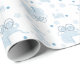 Pretty baby gift wrapping paper done in white, with blue baby prams, flowers, polka dots and blue graphic text reading Baby. Customise to add additional text to this sweet baby paper or leave as is.