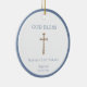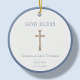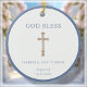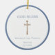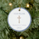 Customisable Baptism ornament keepsake gift, featuring a gold crucifix and blue border.