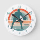 On this attractive clock, a blue silhouette basketball player is placed on a retro style circle rainbow background of distressed stripes. A custom name field in matching blue is at the lower right. Matching blue numbers make the clock easy to read.