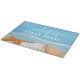 This design features a beach house theme cutting board, with a blue watercolor, ocean sea, tropical island theme, perfect for lake house, with a sand and waves, summer vacation style and cute whimsical, vintage, Adirondack chairs