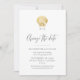 A simple, elegant, and minimalistic modern beach wedding change the date announcement card with a faux gold rustic seashell image and whimsical calligraphy font, and a dusty blue solid background on the back side. Part of a collection of modern and chic beach wedding invitations in the Paper Grape Destinations Zazzle Designer Store.