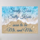 This cute Wedding Poster is accented with the fun saying Sandy Toes Salty Kisses soon to be Mr. and Mrs., making it perfect to mark the way to your beach or tropical wedding ceremony, since it is decorated with blue beach waves, beach sand, starfish, seashells and sand dollars. It is part of the Blue Waves Wedding Collection.
