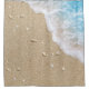 Beautiful blue beach waves rolling up on soft beach sand covered in pretty seashells decorate this shower curtain, making it perfect for the beach themed bathroom.