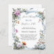 An elegant white background, decorated witth pink and blue wildflowers and a blue ribbon. Personalise and add a name and party details.