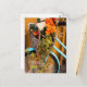 Against an orange wall, a blue bicycle is adorned with a wicker basket that is overflowing with ivy plants and colourful flowers. The photograph was taken during the autumn in Sibiu, Romania. This postcard is fully customisable.