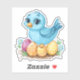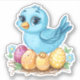 A pretty blue bird sits on coloured Easter eggs in a nest.